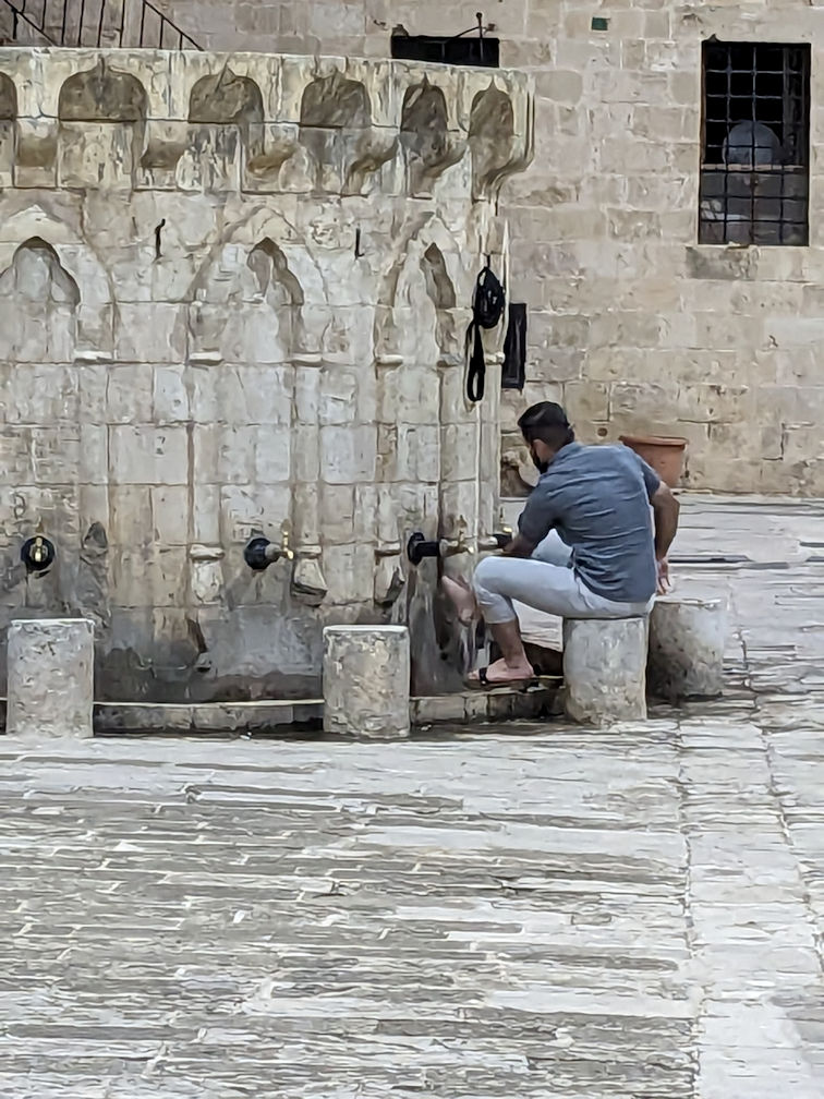 (R) Person washed feet before going into mosque for evening prayer