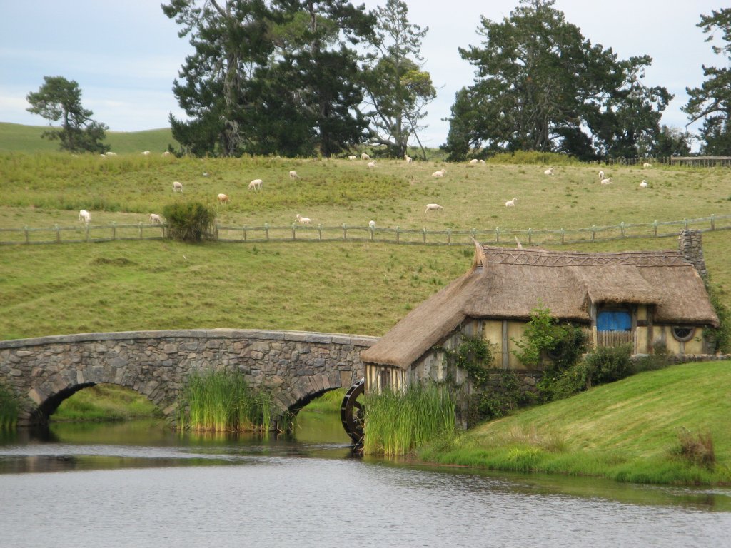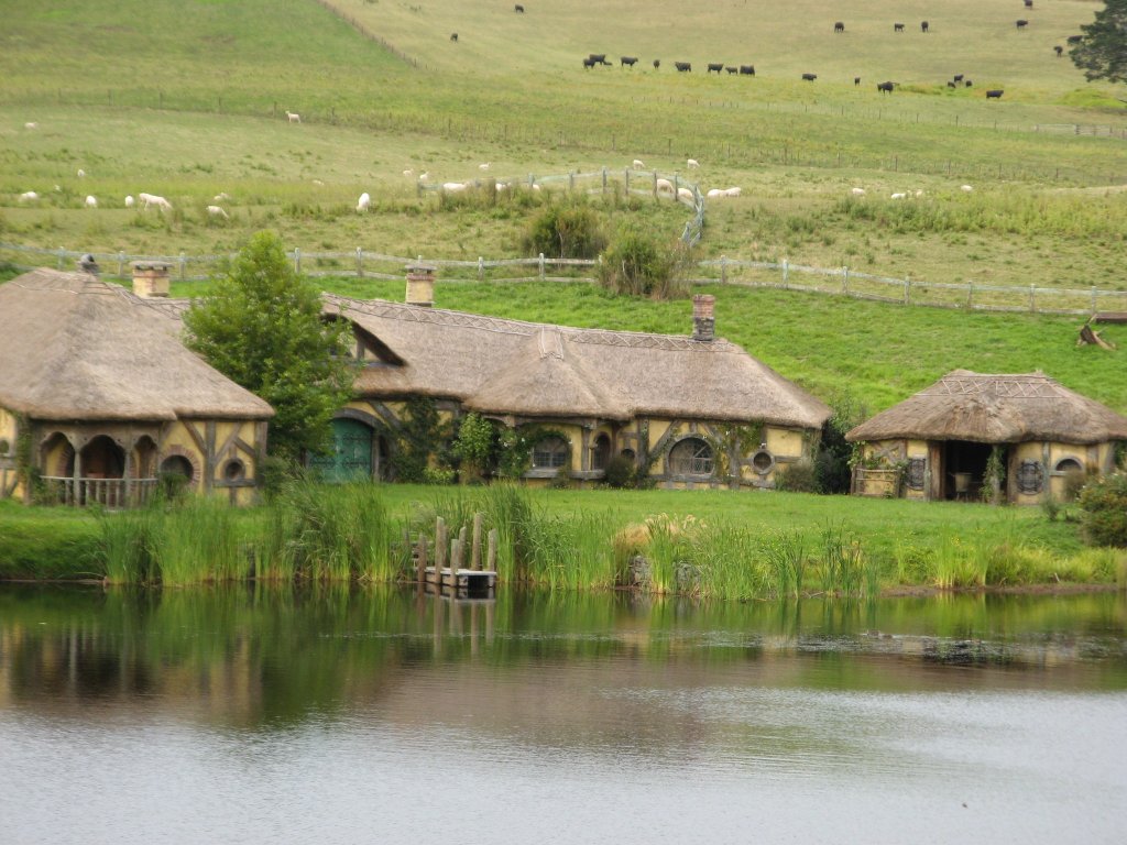 Hobbiton – near Matamata, North Island, NZWe continued the drive north to Matamata, a small village made famous by the filming of the Lord of the Rings, and recently the Hobbit, nearby. At the i-Site we paid for the next day’s earliest tour of Hobbiton, about 20 km southwest on a side road. We stayed at the Maple Lodge in town and had dinner at one of the few restaurants that was open - the Workmen’s Pub. Supposedly where many film crews (not for the Hobbits movie at that time since they finished their filming around December last year) stopped for food, but all the wait staff was sworn to secrecy. Next morning we were on the 9:50 am tour. At the gift shop, we checked around for a nice coffee mug with a hobbit on it, or at least Mt Doom – nada. This place is under-supplied for film buffs looking for souvenirs. There are very tasteful and high quality wool shawls, scarves, blankets, hats, socks and mittens and caps, but only the black beanies say “Hobbiton” on them. We bought two.