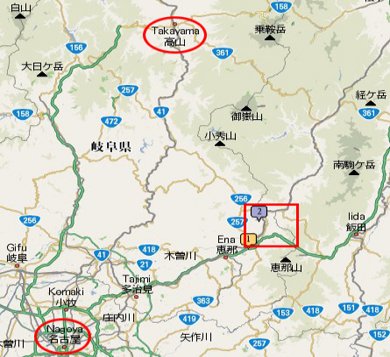 Takayama, Nagoya and Tsumago region, all marked in red. Enlarged map of Tsumago region with Nakasendo trail that we hiked.In cities, many road signs are in English and most trains have announcements in English following the Japanese. But as we got farther from the urban areas, English became less common. The Japanese language itself makes it very difficult for English-speaking tourists to get around in Japan. Japanese can be written in one of two phonetic systems (similar to an alphabet), kanji (Chinese characters), or romaji (Japanese written using the Latin alphabet). David knows a lot of kanji, Alice and Philip can read both of the Japanese phonetic systems (hiragana and katakana), and all four of us could pronounce the romaji. Therefore, it becomes harder to navigate in rural areas, where road signs are written only in kanji which our English guidebooks often didn't include. Tsumago was full of tourists in the daytime, but after 5 pm all the tourists went home and it was pleasant and deserted. We stayed in a ryokan(traditional Japanese inn) for two nights. The floor of our room was covered with tatami mats (woven from straw) and contained a low table but no chairs. The room was mostly empty during the day, but at night futons were spread on the floor so we could sleep. There was no air conditioning in the room, but luckily the temperature in the mountains was significantly cooler than the cities and coastal areas. ![]() A traditional Japanese house in Tsumago.![]() Nagiso,a small, modern Japanese town.The ryokan served us traditional and fancy meals for breakfast and dinner. There were no menus: we simply ate what they served us. Typically the meals consisted of many small dishes of pickled vegetables and meat or fish. We ate typical food like tempura, miso soup, and pan-fried whole fish. There were also a few more unusual items: sweetened grasshoppers, raw tuna, and slices of raw horse meat. ![]() Inside the ryokan: our room is through the open door.![]() Dinner at the ryokan.On one day, we hiked from Tsumago to Magome on five miles of the old post road, and then took the bus back to Tsumago. The road goes through some farmland so we had a closer view of farmhouses, rice fields and forests. Despite the population pressure, much of the hills remains forested. Near the end of the hike, we were caught in a thunderstorm, but fortunately we had umbrellas. ![]() The old post road between Tsumago and Magome.![]() Farm houses and rice fields along the post road.Sign Guestbook Back to Home Page Back to Japan Trip Main Page Tokyo Part 1 Kyoto Himeji Castle Fushimi Shrine Hiroshima and Miyajima Takayama Tokyo Part 2 Food Japan and the War (Under construction) Miscellaneous (Under construction) |