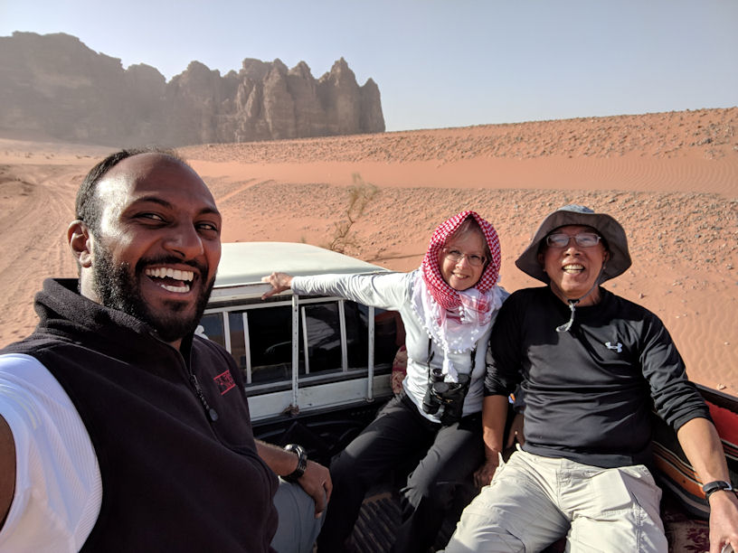 Before dinner, we went on the wilderness adventure of a 2-hour, 4x4 jeep adventure in Wadi Rum to watch the sunset, following the footsteps of Lawrence of Arabia, climbing sand dunes and rock bridges. We also had a camel ride (video) and saw ancient petrographs. The camels were fitted with seats and it was not easy to tell whether they had one or two humps. But the petrographs showed us they are one-hump. Then we drove back to the camp where we enjoyed a delicious Bedouin dinner and a starry night in the desert.