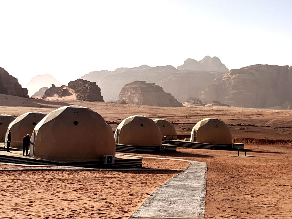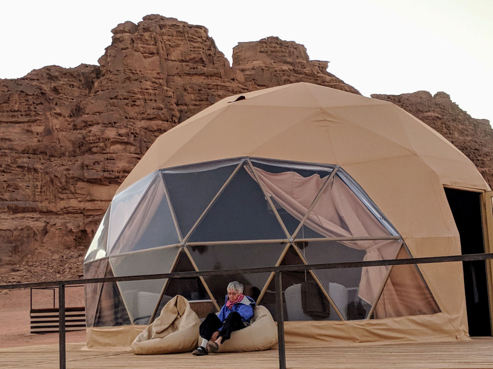 When we arrived at our next accommodation - the Sun City Camp - there was another surprise. The tents were geodesic domes. The domes, the red color sand and mountains evoked Mars. We fell for this tourist trap. It was pretty cool.