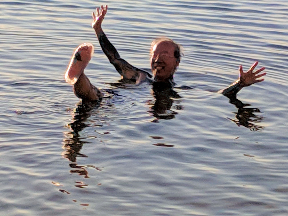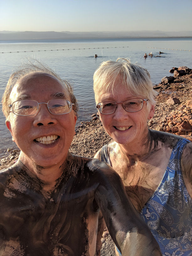 The next morning we left Sun City Camp to head back north to the Dead Sea. On the way we stopped in Madaba for lunch in a historical old home turned into restaurant, the oldest in Madaba. The restaurant is owned by a woman who seemed very respected and well known. She did not wear a headscarf. She may be Muslim, we think. 99% of the women we have seen on trip wear headscarf, whether on the streets of Madaba or smaller villages and even Amman. We arrived at Dead Sea Marriott at maybe 3 pm, in time to take a swim. The hotel is within walking distance to the Dead Sea which is 1400 feet below sea level. It was hot, probably in the 90's. Ayman said a lovely goodbye, telling David he appreciated all the information about the Open Street Map app and other things. David got kissed on both cheeks, as is the custom among Jordanian men who are very good friends.